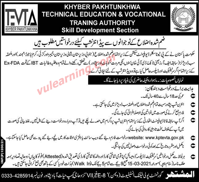 Advertisement of KP TEVTA Skill Development Section Internship Program 2021 for Merged Areas Districts Students Latest-104699