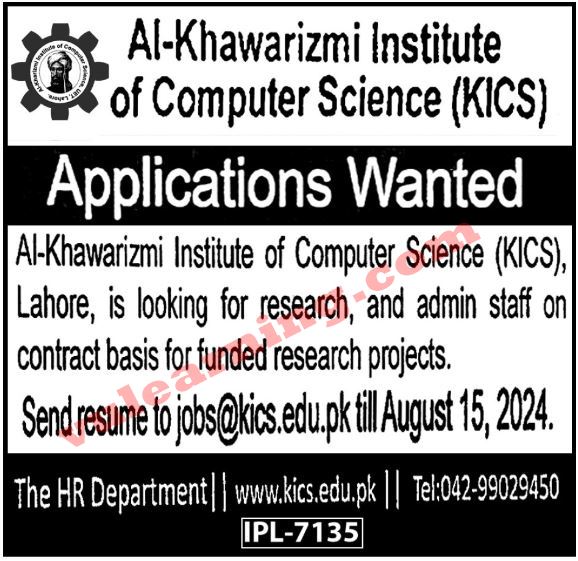 Al-Khawarizmi Institute of Computer Sciences UET Lahore Jobs 2024 for Research & Admin Staff Job Ad shown on this page is taken from Express Newspaper on 31-07-2024