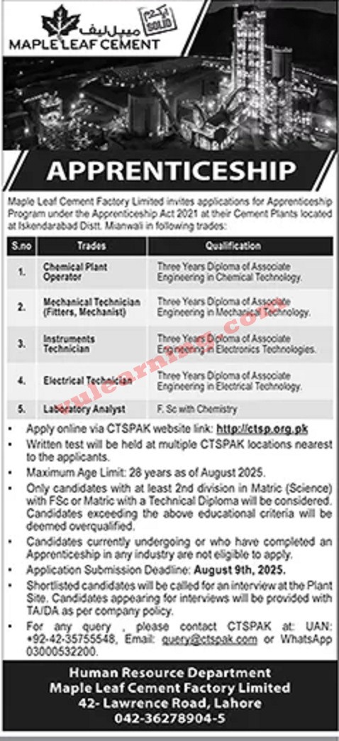 Advertisement of Maple Leaf Cement Factory Mianwali Apprenticeships 2025 Apply Online Apprentices Jobs Latest-264189