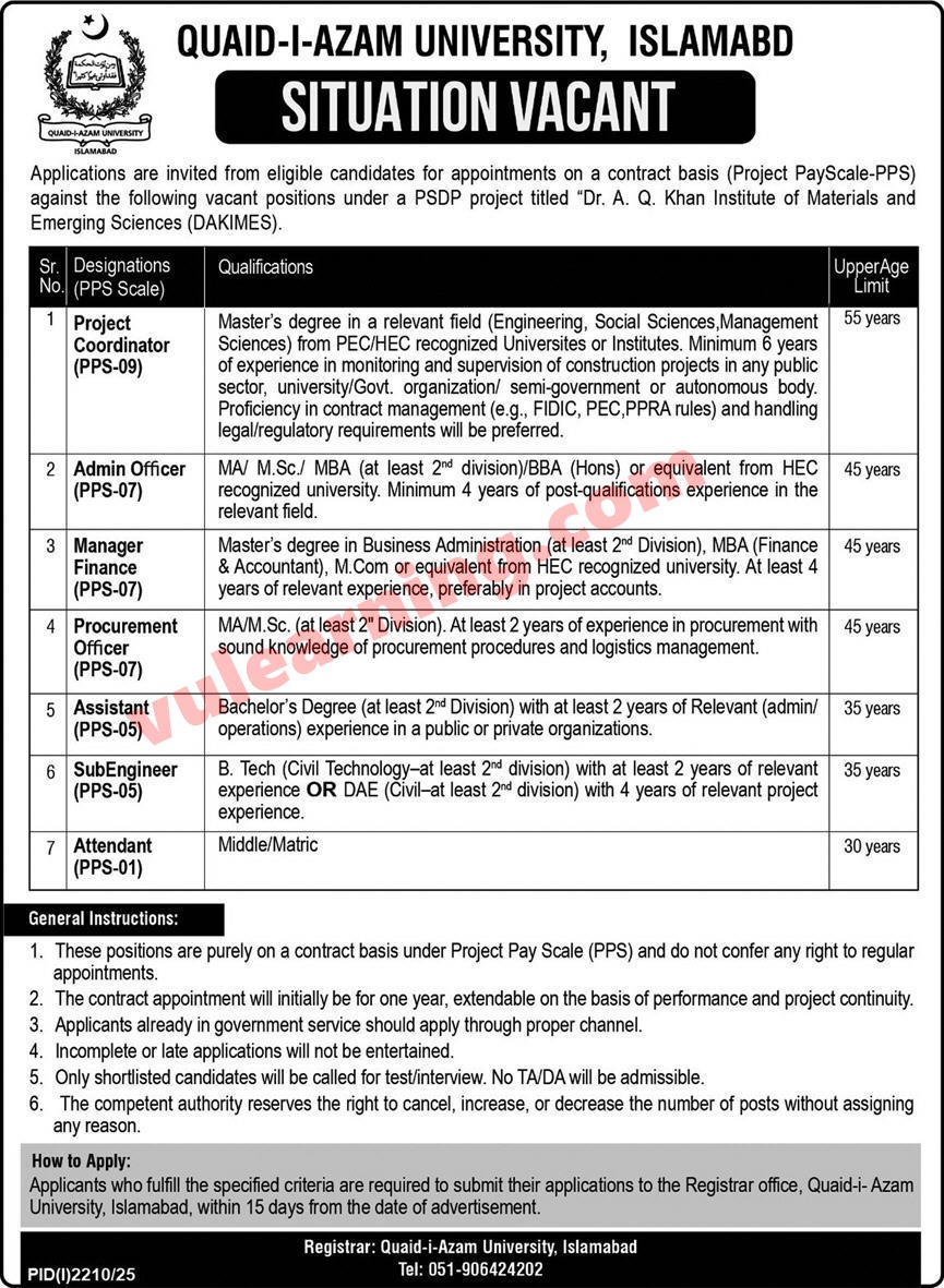 Quaid e Azam University Islamabad Jobs 2025 for Admin Officer, Assistant, Sub Engineer & Others QAU Latest Job Ad shown on this page is taken from Jang Newspaper on 14-09-2025