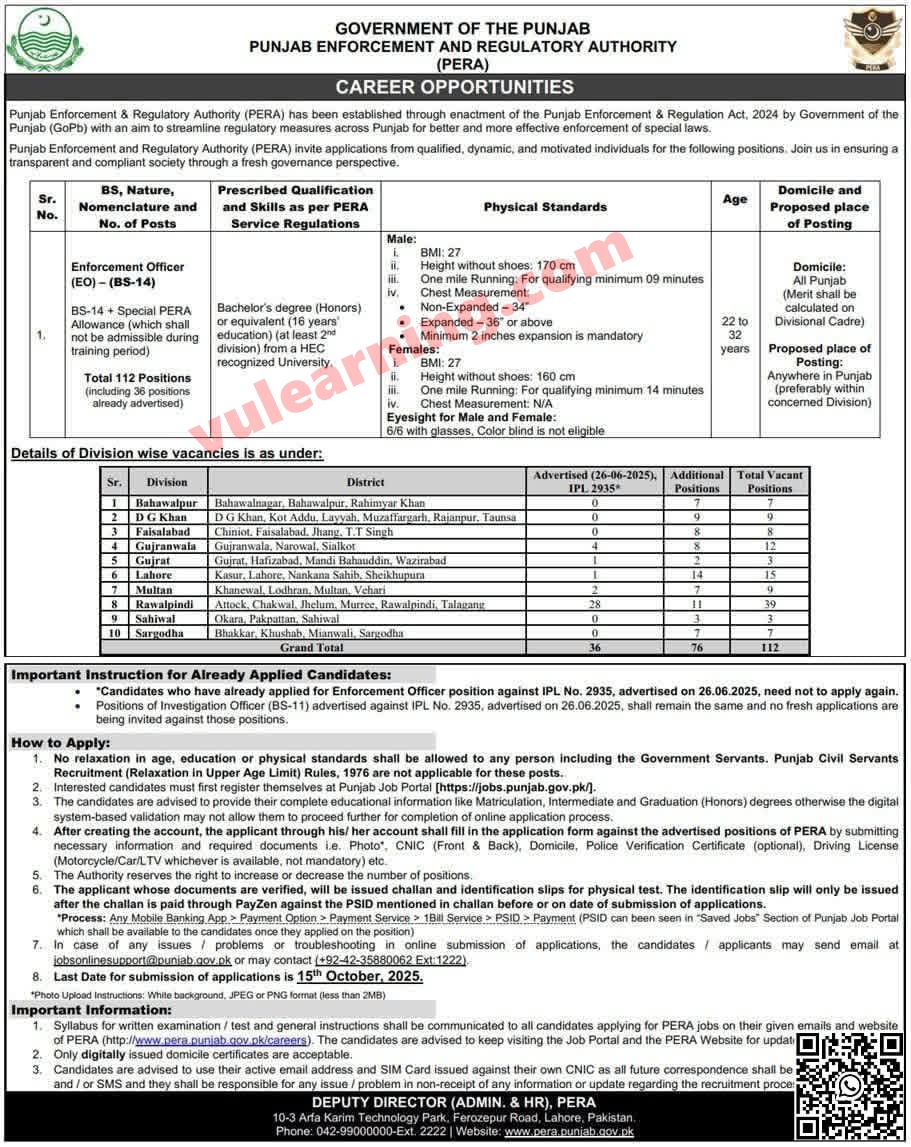 PERA Jobs 2025 for 112 Enforcement Officers BPS-14 Apply Online Job Ad shown on this page is taken from Not in Newspaper Newspaper on 18-09-2025