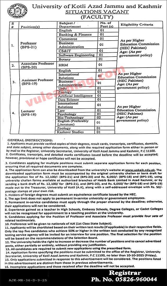 University of Kotli Azad Kashmir AJK Jobs 2025 for Lecturers, Assistant / Associate Professors & Professors Job Ad shown on this page is taken from Express Newspaper on 19-09-2025
