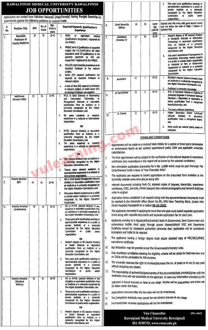 Rawalpindi Medical University RMU Jobs 2025 for Jr Clerks, IT Technicians, Deputy Directors & Others Job Ad shown on this page is taken from Express Newspaper on 18-09-2025