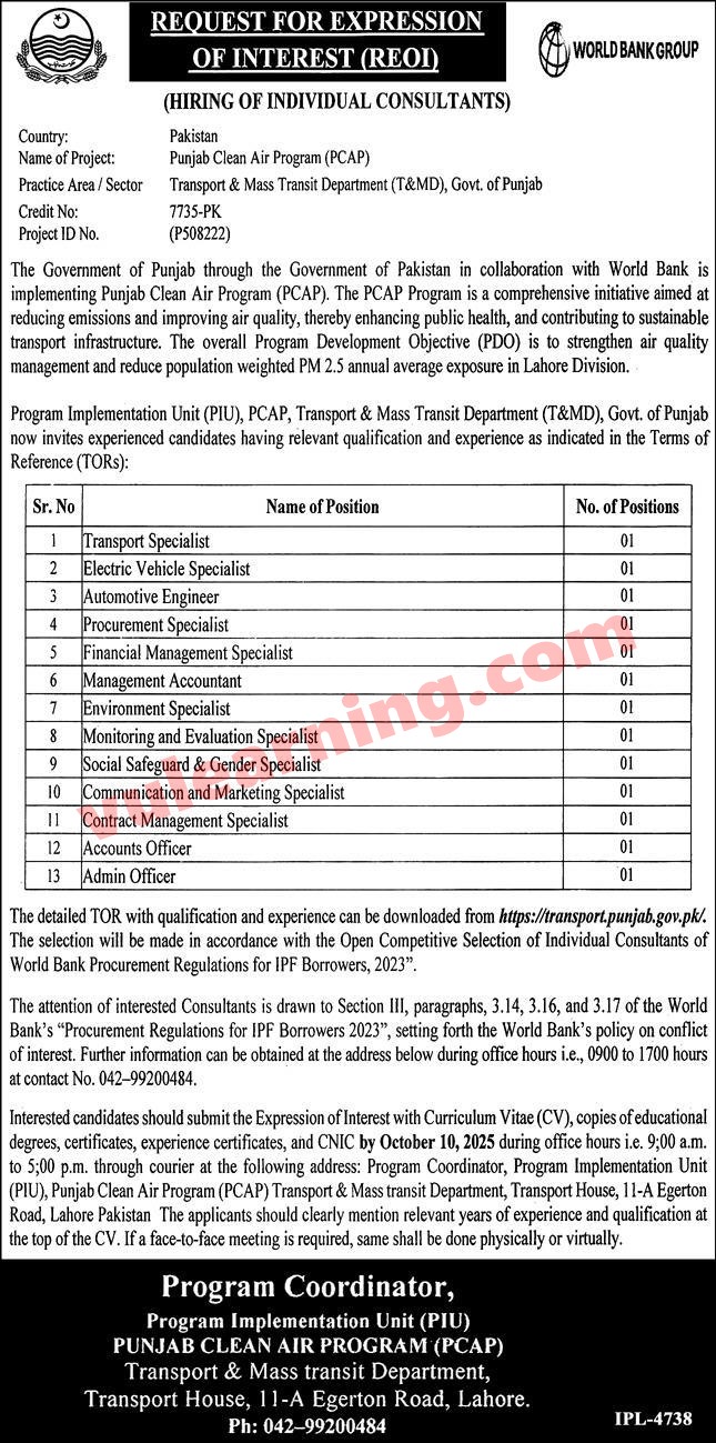 Transport & Mass Transit Department Punjab Jobs 2025 for Punjab Clean Air Program Project Vacancies Job Ad shown on this page is taken from Express Newspaper on 23-09-2025