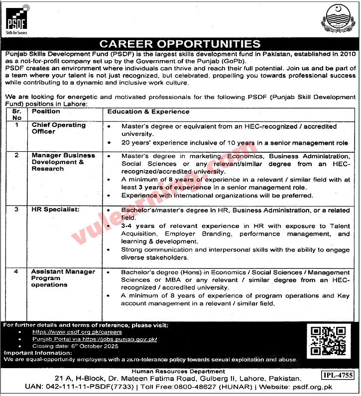Punjab Skills Development Fund PSDF Jobs 2025 For Head Office Lahore Apply Online Job Ad shown on this page is taken from Express Newspaper on 24-09-2025