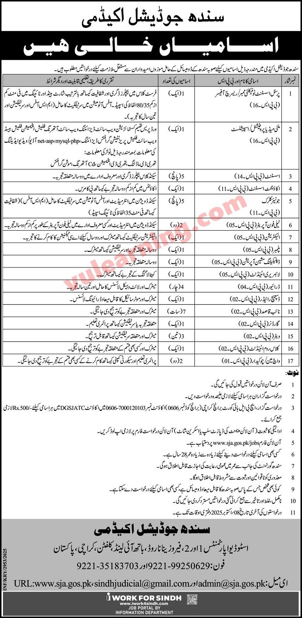Advertisement of Sindh Judicial Academy Karachi Jobs 2025 for Assistants, Jr Clerks, Drivers, Naib Qasid, Waiters, Chowkidar & Others-294792