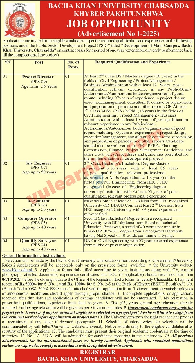 Bacha Khan University Charsadda Jobs 2025 for Computer Operator, Engineer, Accountant, Surveyor & Project Director Job Ad shown on this page is taken from Aaj Newspaper on 25-09-2025