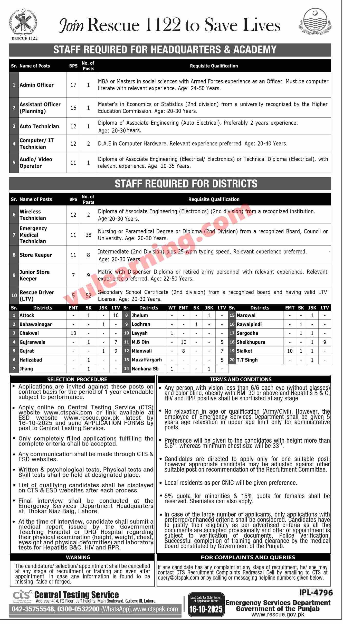 Rescue 1122 Jobs 2025 for Drivers, Medical Technicians, Store Keepers * Others Online Apply Job Ad shown on this page is taken from The Nation Newspaper on 27-09-2025