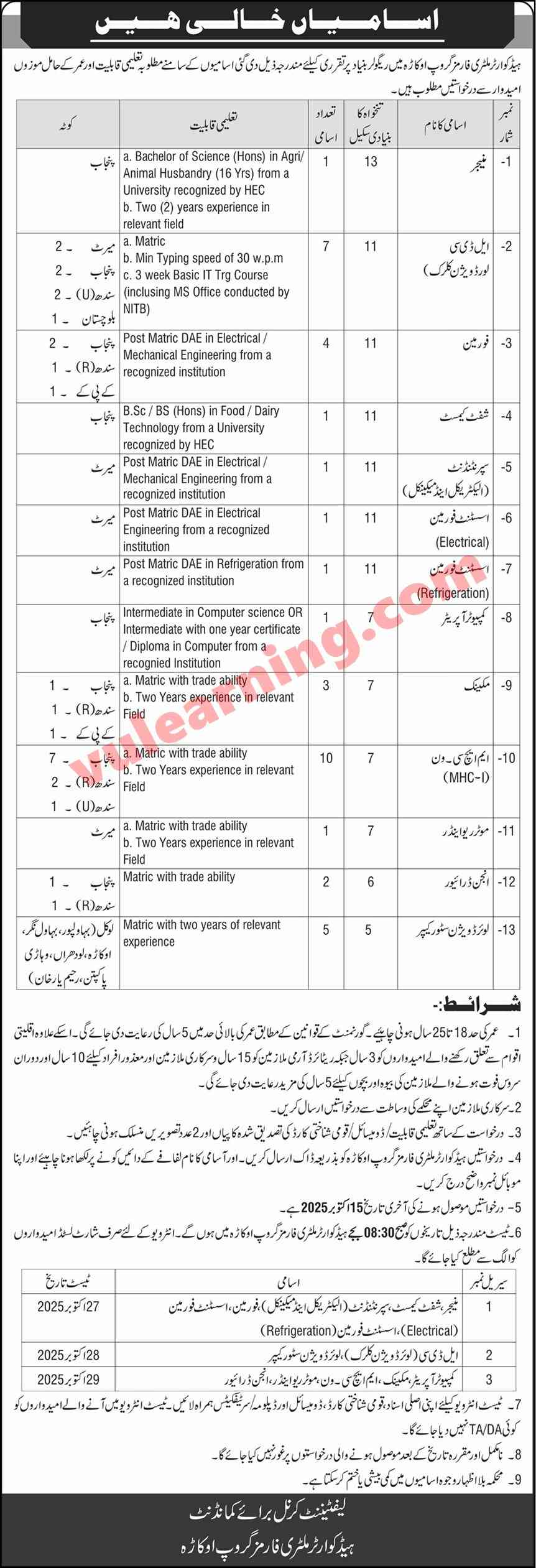 Military Farms Group Okara Jobs 2025 for Clerks, Store Keepers, Foreman, Mechanics & Others Job Ad shown on this page is taken from Express Newspaper on 28-09-2025