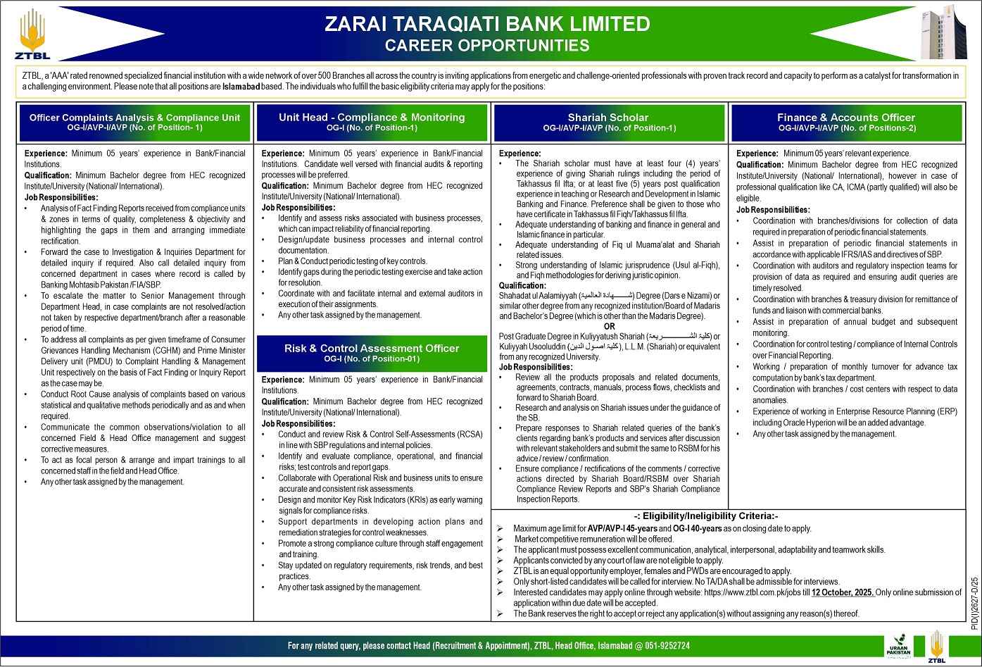 ZTBL Jobs 2025 Apply Online for Zarai Taraqiati Bank Limited Islamabad Job Ad shown on this page is taken from Jang Newspaper on 28-09-2025
