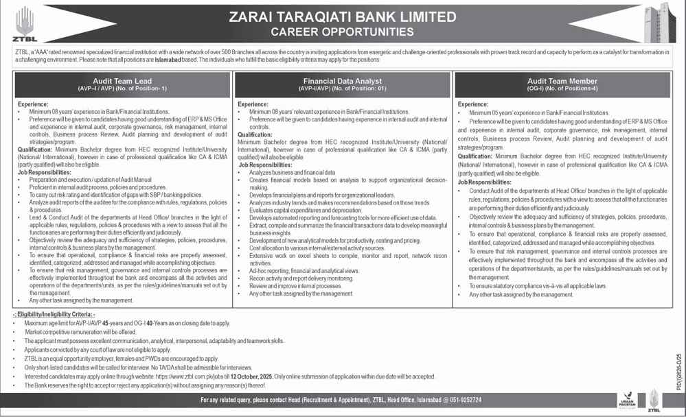 ZTBL Bank Jobs 2025 Apply Online for Zarai Taraqiati Bank Limited in Islamabad Job Ad shown on this page is taken from Jang Newspaper on 28-09-2025