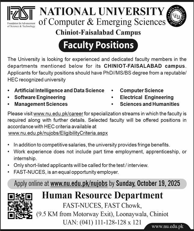 National University FAST Jobs 2025 for Teaching Faculty in Chiniot - Faisalabad Campus Job Ad shown on this page is taken from Jang Newspaper on 28-09-2025