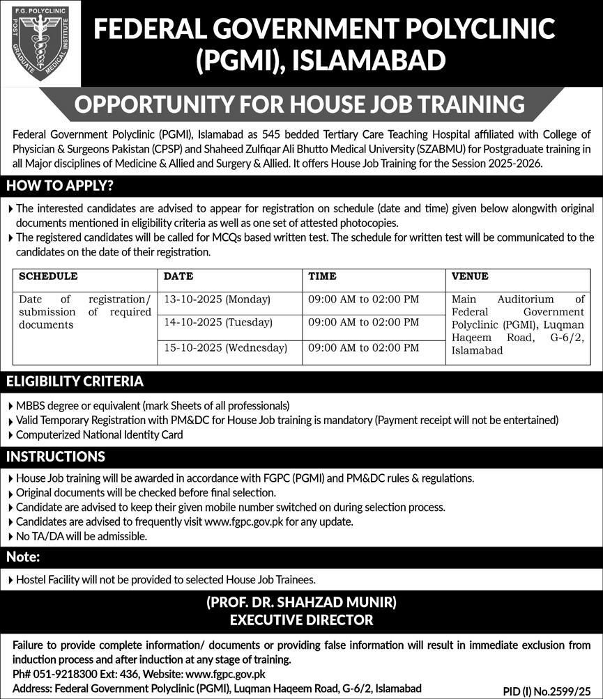 Federal Government Polyclinic Islamabad House Job Training 2025 House Job Trainees PGMI Latest Job Ad shown on this page is taken from The News Newspaper on 28-09-2025