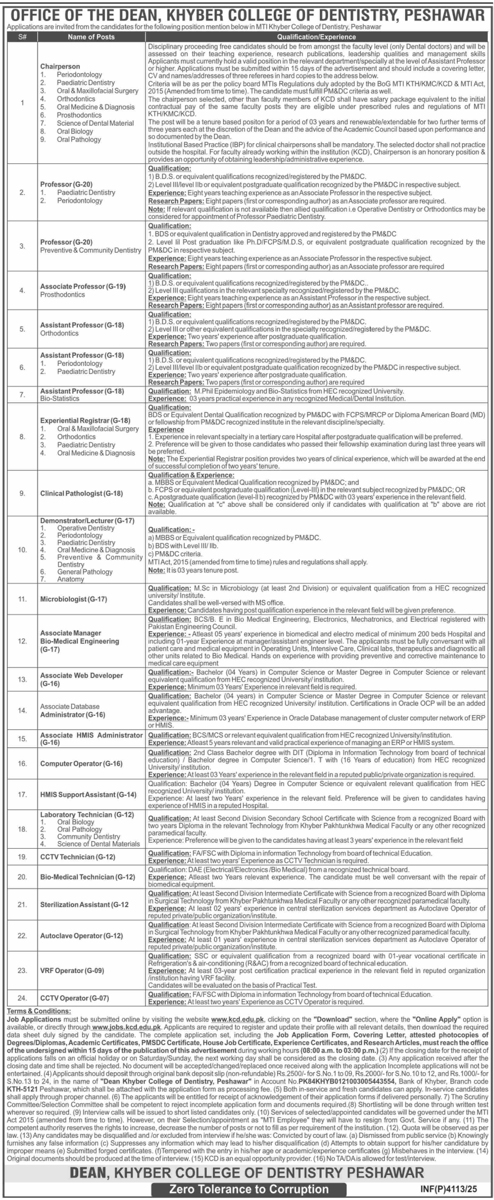 Khyber College of Dentistry Peshawar Jobs 2025 Apply Online Teaching Faculty & Others KCD MTI Latest Job Ad shown on this page is taken from Dawn Newspaper on 28-09-2025