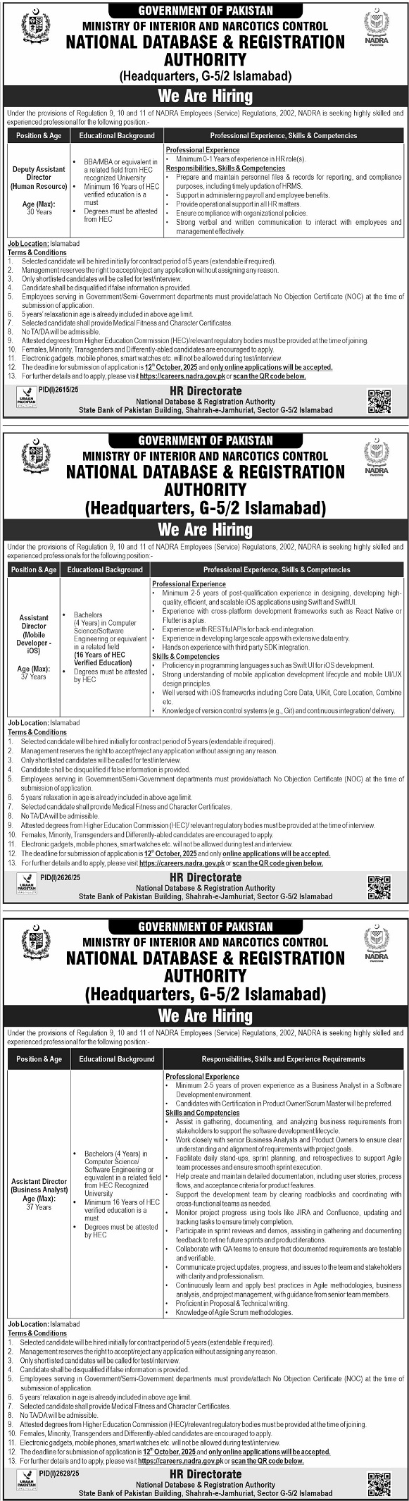 NADRA Jobs 2025 Apply Online for Assistant Directors & Deputy Assistant Director Job Ad shown on this page is taken from Jang Newspaper on 28-09-2025