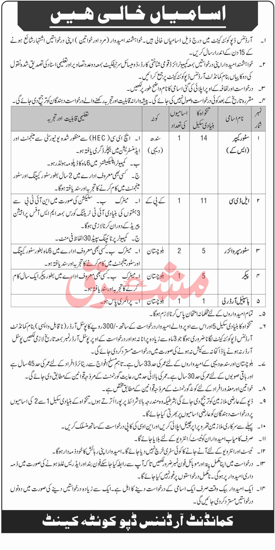 Advertisement of Pak Army Ordnance Depot Quetta Cantt Jobs 2025 for Supervisors, Clerk, Store Keeper & Others-294843