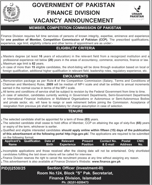 Advertisement of Finance Division Islamabad Jobs 2025 for Member of Competition Commission of Pakistan CCP-294846