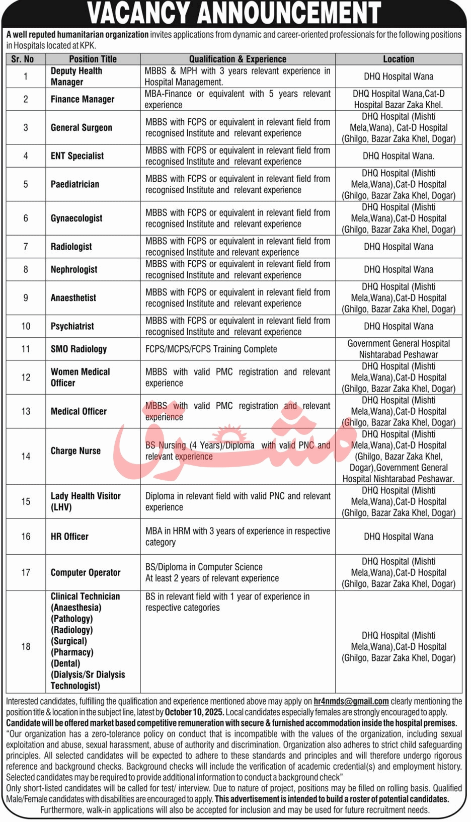Reputed Humanitarian Organization NGO Jobs in KPK 2025 for Medical Technicians, Nurses & Others NMD MERF Latest Job Ad shown on this page is taken from Mashriq Newspaper on 28-09-2025
