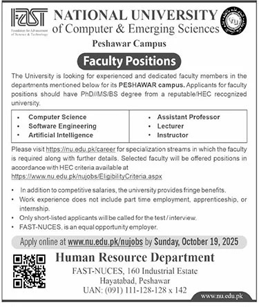 FAST University Jobs 2025 for Assistant Professors, Lecturers, Instructors at Peshawar Campus Job Ad shown on this page is taken from The News Newspaper on 28-09-2025