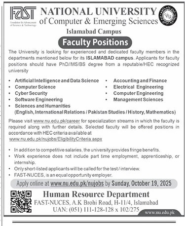 FAST National University Jobs 2025 for Teaching Faculty at Islamabad Campus Apply Online Job Ad shown on this page is taken from The News Newspaper on 28-09-2025