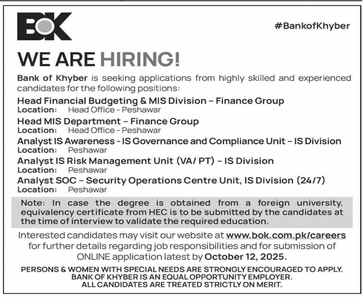 Bank of Khyber BoK Jobs 2025 Apply Online for Analysts & Heads in Peshawar Job Ad shown on this page is taken from Dawn Newspaper on 28-09-2025