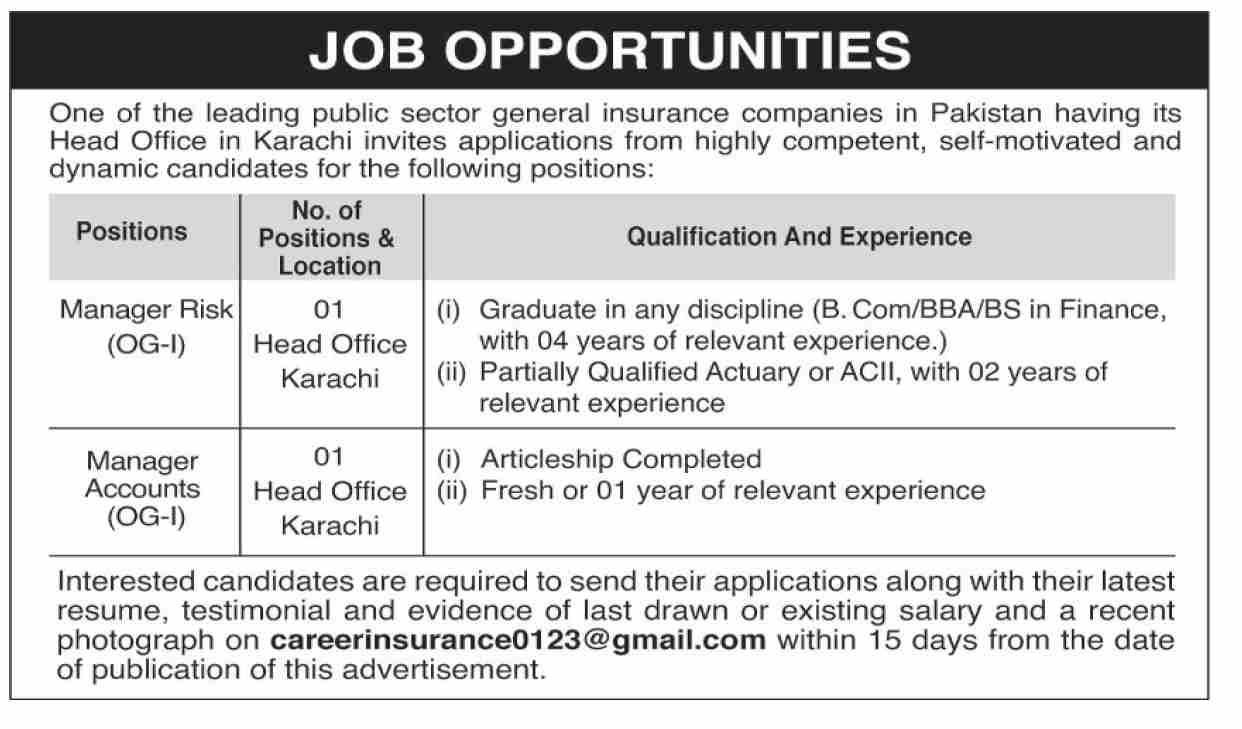 Advertisement of Leading Public Sector Insurance Company Jobs 2025 for Managers at Head Office Karachi-294860