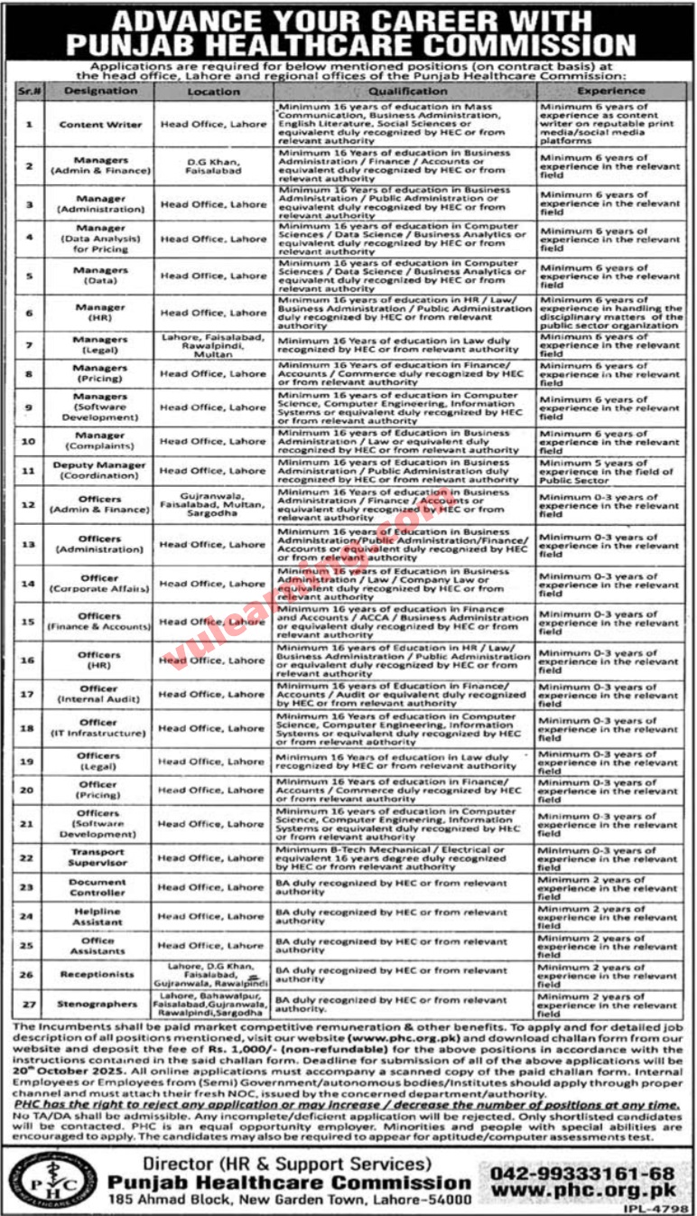 Punjab Healthcare Commission Jobs 2025 Apply Online for Stenographers, Receptionists & Others PHC Job Ad shown on this page is taken from Jang Newspaper on 27-09-2025