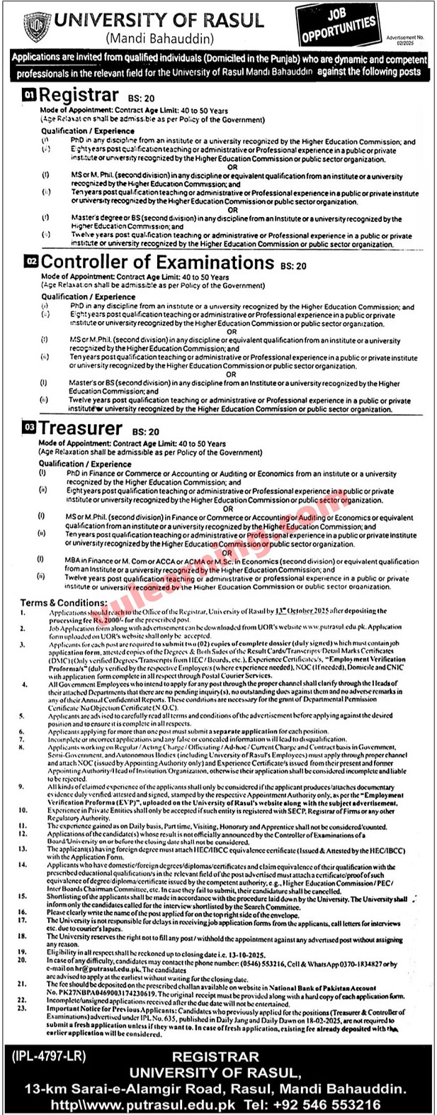 University of Rasul Mandi Bahauddin Jobs 2025 for Registrar, Controller of Examination & Treasurer Job Ad shown on this page is taken from Express Newspaper on 27-09-2025
