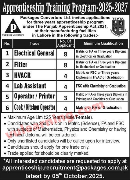 Packages Converters Ltd Apprenticeship Training Program 2025 at Lahore Job Ad shown on this page is taken from Express Newspaper on 30-09-2025