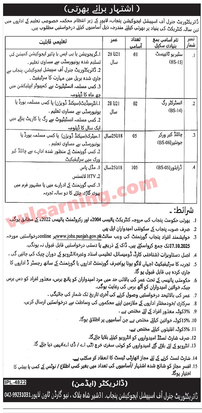 Advertisement of Directorate General of Special Education Punjab Jobs 2025 for 113+ Drivers & Others Apply Online-294877