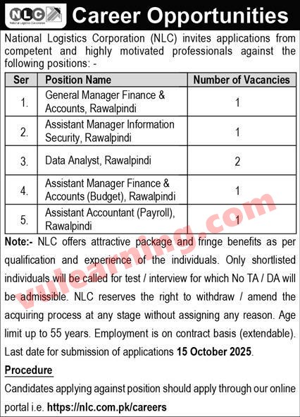 NLC Jobs 2025 Apply Online for Assistant Managers, Data Analysts & Others National Logistics Corporation Job Ad shown on this page is taken from Express Newspaper on 01-10-2025