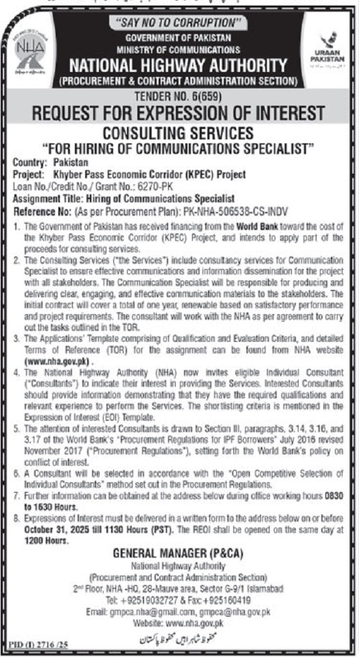 National Highway Authority NHA Jobs 2025 Khyber Pass Economic Corridor (KPEC) Project Job Ad shown on this page is taken from Jang Newspaper on 02-10-2025