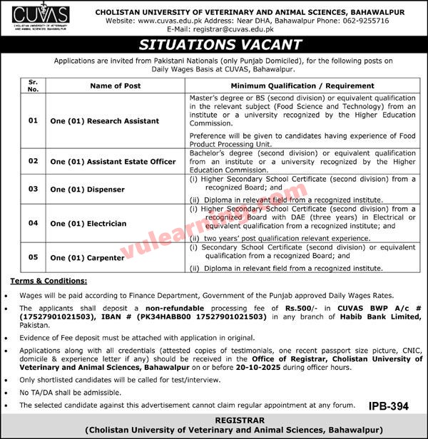 CUVAS Bahawalpur Jobs 2025 for Assistants, Electrician, Dispenser, Carpenter & Others Job Ad shown on this page is taken from The Nation Newspaper on 03-10-2025