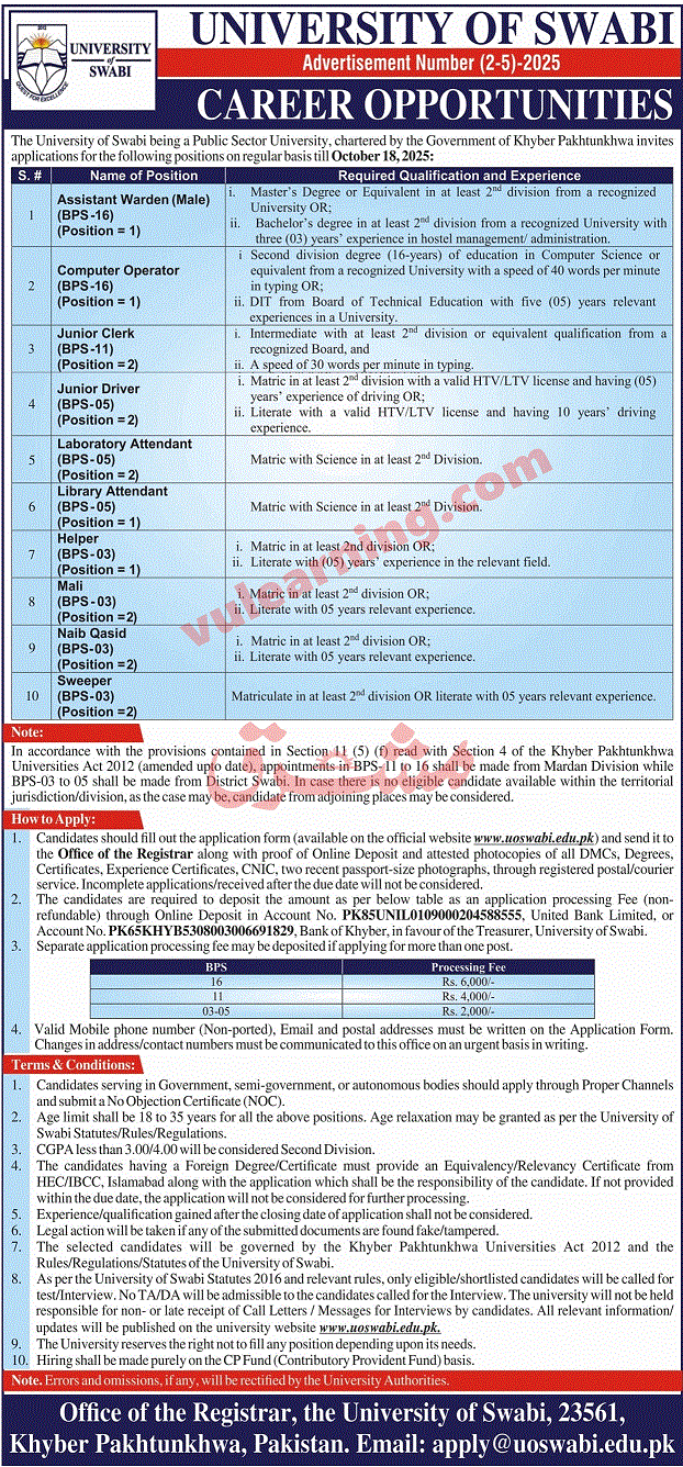 Advertisement of University of Swabi Jobs 2025 for Jr Clerks, Drivers, Mali, Lab Attendants, Naib Qasid, Sweepers & Others-294906