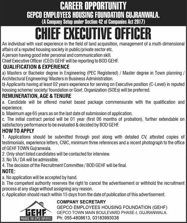 Advertisement of GEPCO Employees Housing Foundation Gujranwala Jobs 2025 for Chief Executive Officer (CEO) GEHF-294909