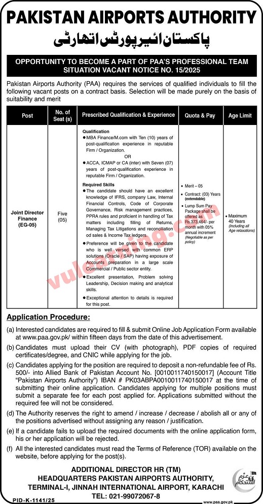 Pakistan Airports Authority PAA Jobs 2025 Apply Online for 5 Joint Directors Finance Job Ad shown on this page is taken from Express Newspaper on 04-10-2025