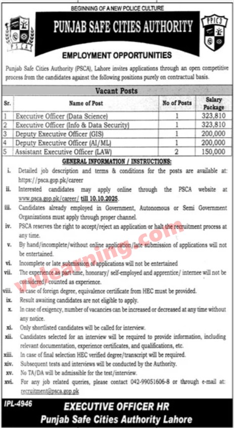Punjab Safe Cities Authority PSCA Jobs 2025 for Assistant Executive Officers, Executive Officers & Other Apply Online Job Ad shown on this page is taken from Jang Newspaper on 04-10-2025