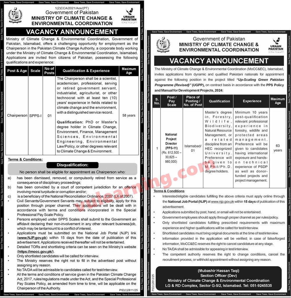 Climate Change Ministry & Environmental Coordination Islamabad Jobs 2025 MoCC&EC Apply Online Job Ad shown on this page is taken from Jang Newspaper on 04-10-2025