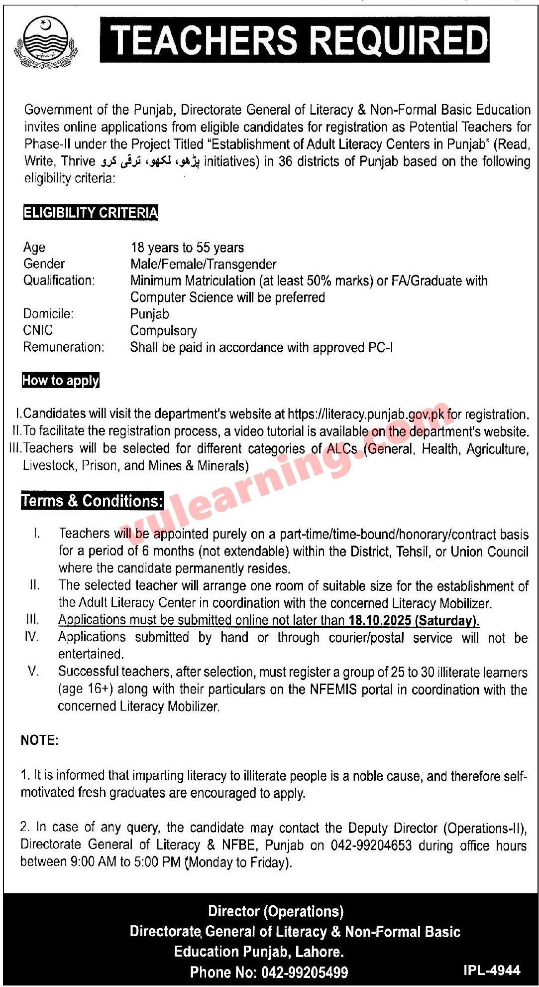 Literacy & Non-Formal Education Department Punjab Jobs 2025 for Teachers Apply Online Job Ad shown on this page is taken from Express Newspaper on 05-10-2025