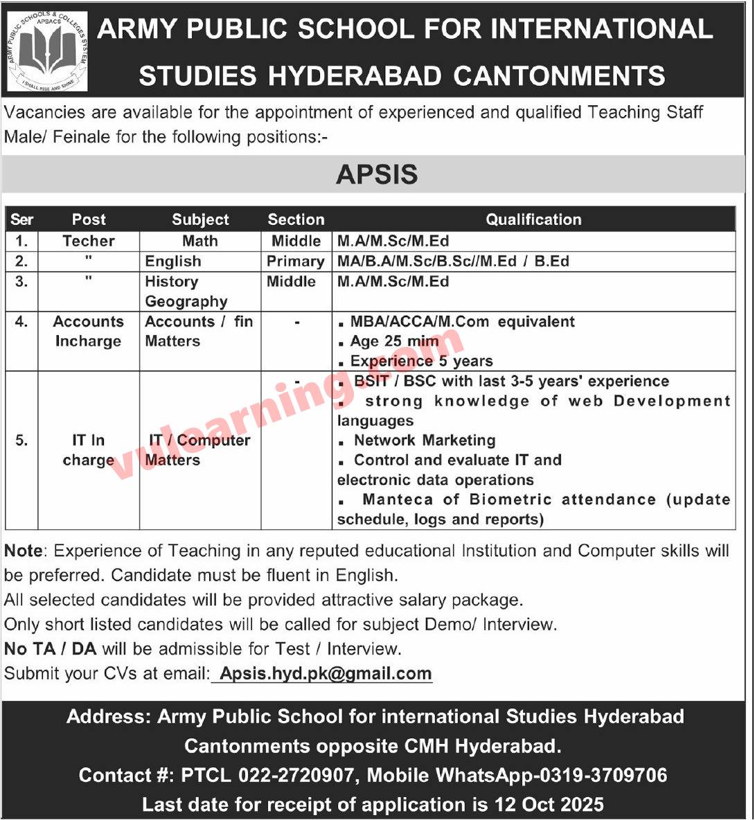 Army Public School for International Studies Hyderabad Jobs 2025 for Teachers & Others APSIS Latest Job Ad shown on this page is taken from Express Newspaper on 05-10-2025