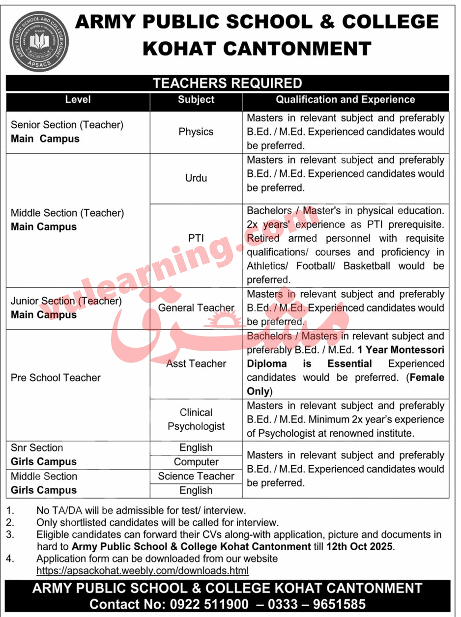 Army Public School and College Kohat Cantt Jobs 2025 for Teachers & Others APS&C Latest Job Ad shown on this page is taken from Mashriq Newspaper on 05-10-2025