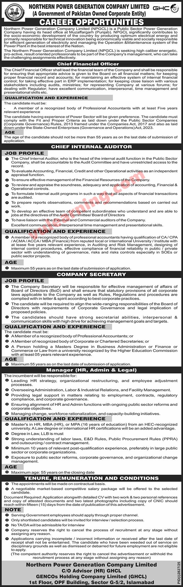 Advertisement of Northern Power Generation Company Ltd NPGCL Jobs 2025 GENCOs Holding Company Ltd GHCL -294933