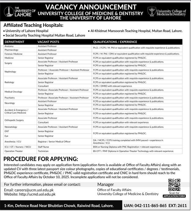 University of Lahore UOL Jobs for Teaching Faculty & Others at University College of Medicine & Dentistry Latest Job Ad shown on this page is taken from Jang Newspaper on 05-10-2025