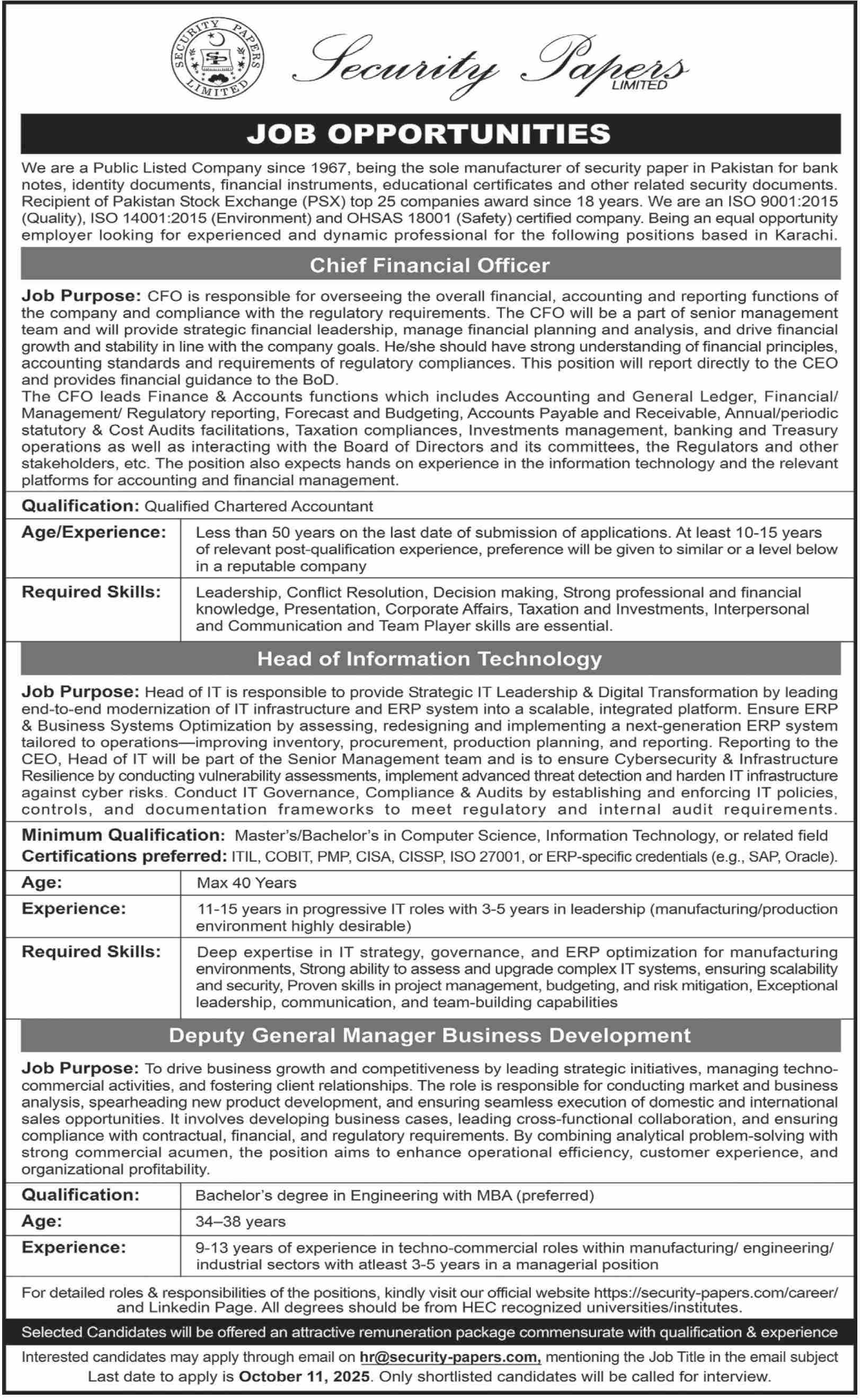 Security Papers Limited SPL Karachi Jobs 2025 Pakistan Security Printing Corporation PSPC Job Ad shown on this page is taken from Dawn Newspaper on 05-10-2025