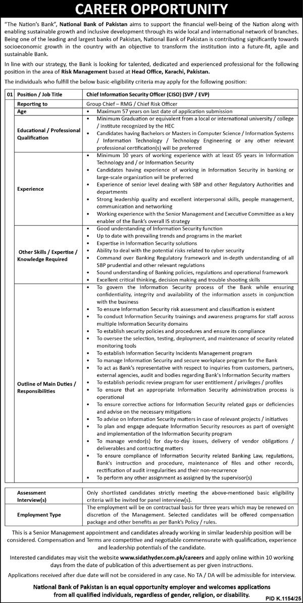 Advertisement of NBP Jobs 2025 Apply Online for Chief Information Security Officer at Head Office Karachi-294961
