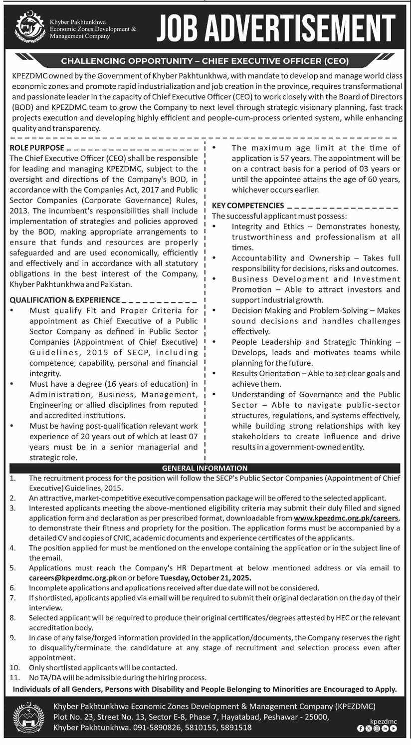 Advertisement of KP Economic Zones Development & Management Company Jobs 2025 for Chief Executive Officer CEO-294963