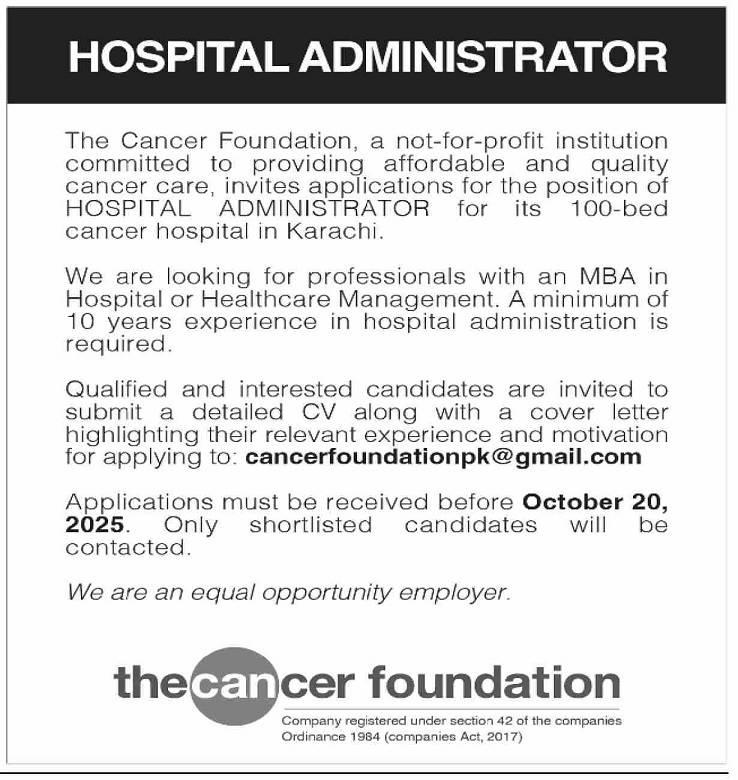 Cancer Foundation Karachi Jobs 2025 for Hospital Administrator at Cancer Hospital Job Ad shown on this page is taken from Dawn Newspaper on 07-10-2025