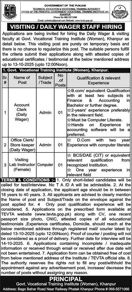 Advertisement of TEVTA Govt Vocational Training Institute Jobs 2025 for Clerks, Store Keeper & Instructor-294976