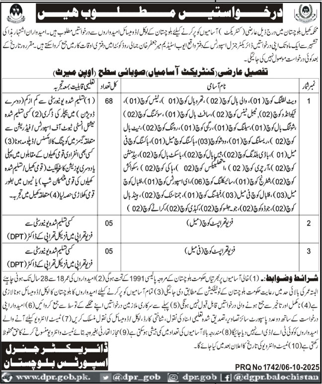 Advertisement of Sports Department Balochistan Jobs 2025 for Coaches & Physiotherapists (Male & Female)-294977