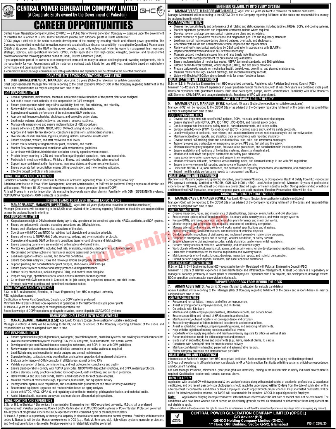 Central Power Generation Company Ltd CPGCL Jobs 2025 for Assistant Managers, Managers, Assistants & Others Job Ad shown on this page is taken from Jang Newspaper on 08-10-2025